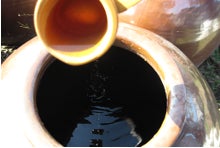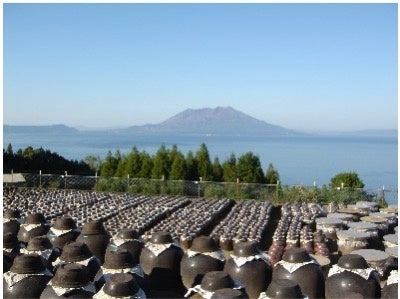 桜島を望む壺畑(つぼばたけ)で、 江戸時代から造られる琥珀色のお酢。
